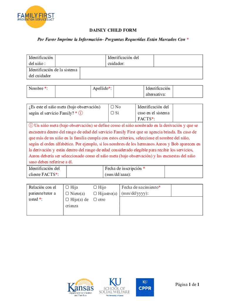 El Formulario Daisy Child es un documento vital utilizado para la identificación y registro de un niño en los Servicios de Prevención Family First. Este formulario es fundamental para los padres y tutores, ya que ayuda a recopilar información clave, como el nombre del niño y detalles de contacto del tutor. La importancia del Daisy Child Form radica en su capacidad para facilitar el acceso a servicios que apoyan el desarrollo y bienestar del niño.