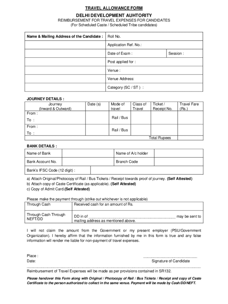 The Travel Allowance Form is designed for candidates from Scheduled Caste or Scheduled Tribe backgrounds who have participated in examinations administered by the Delhi Development Authority and seek reimbursement.