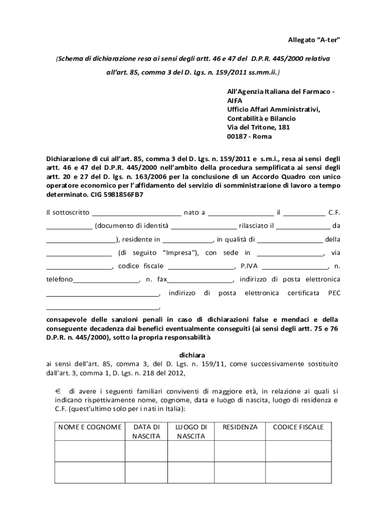 Chiunque necessiti di certificazione AIFA o partecipi a gare d'appalto deve compilare il Modulo di Dichiarazione Anti-Mafia per attestare l'assenza di condanne penali.
