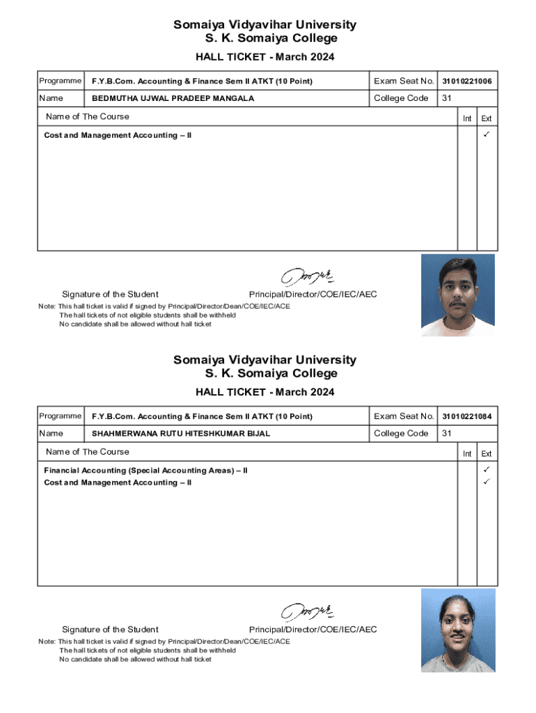 Get the free Somaiya Vidyavihar University Hall Ticket