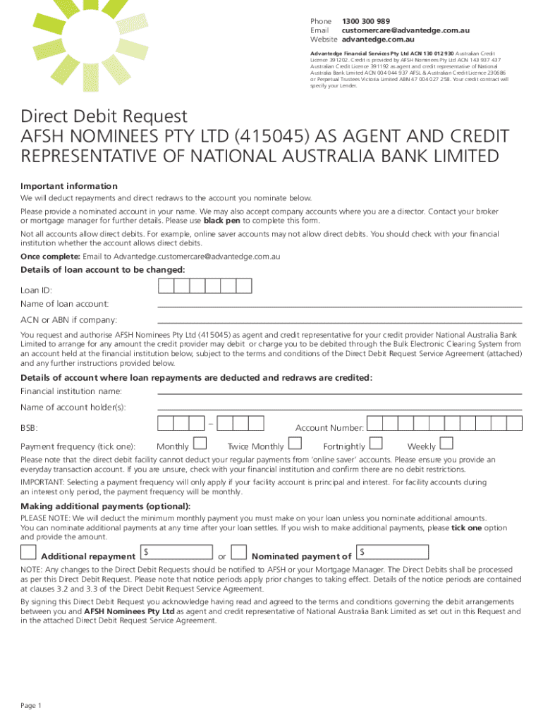 The Australian Direct Debit Request Form is a financial document used by individuals to authorize AFSH Nominees Pty Ltd to deduct loan repayments directly from their bank accounts.