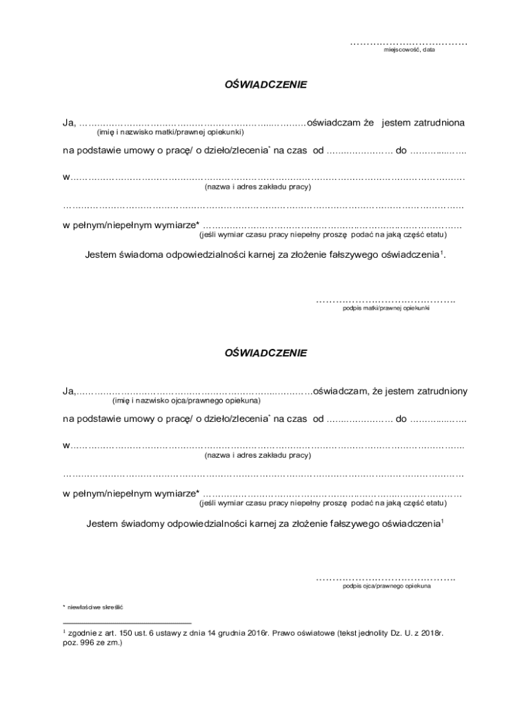 The Employment Verification Declaration is a Polish document used by parents or legal guardians to verify employment status for educational or legal purposes.