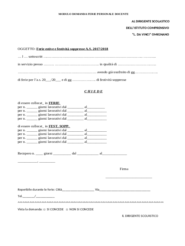 Il Modulo di Richiesta di Vacanza per Insegnanti è un documento utilizzato dagli insegnanti in Italia per richiedere giorni di vacanza e compenso per le festività annullate.