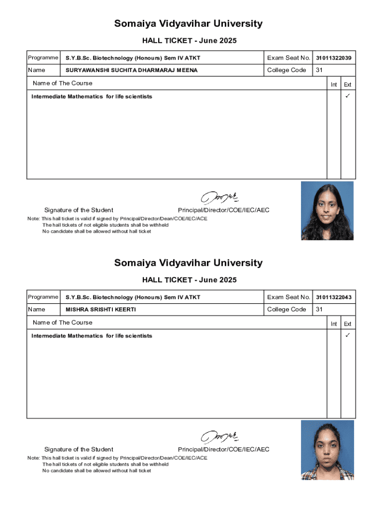The Somaiya Vidyavihar University Hall Ticket is an essential document for students participating in university examinations. It serves a crucial role in the examination process, acting as proof of eligibility and verification of enrollment. Key components of the hall ticket include the student's name, seat number, college code, and course name. For S.Y.B.Sc. Biotechnology (Honours) Semester IV students, possessing this hall ticket is particularly important, as it allows entry into examinations conducted by the university.