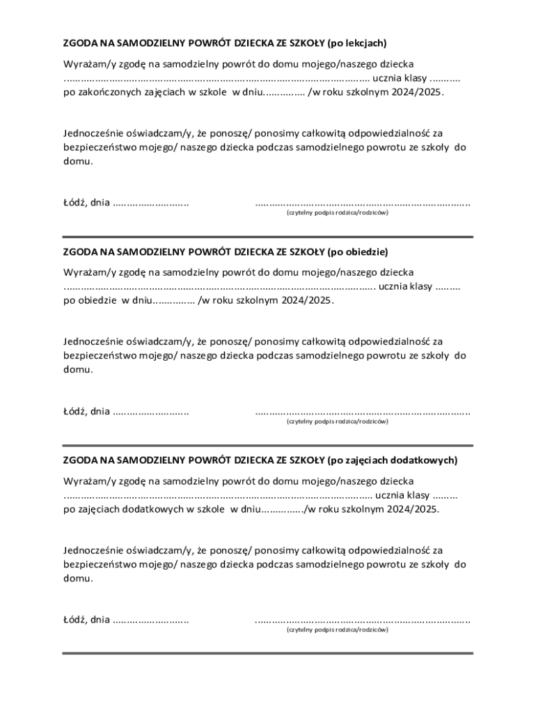 The form must be signed by a parent or legal guardian, as it details the child's independent return from school and assumes parental responsibility for their safety.