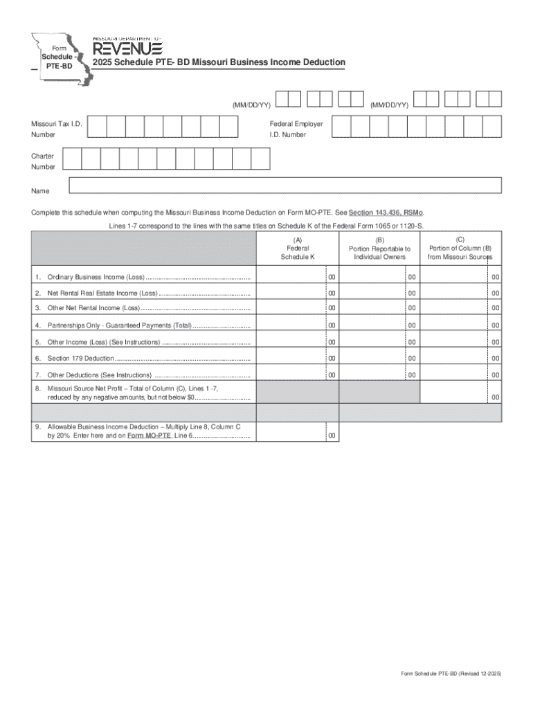 The Missouri Business Income Deduction Form PTE-BD is a critical document that enables businesses in Missouri to calculate their allowable business income deduction. This form plays a vital role in determining the Missouri Business Income Deduction on Form MO-PTE. To accurately complete the PTE-BD, businesses must reference information from Federal Form 1065 or 1120-S, Schedule K, ensuring they leverage relevant federal data to compute their deductions effectively.
