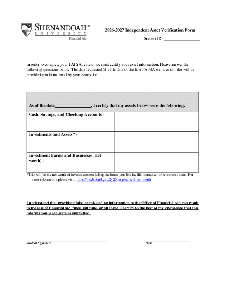 The 2026-2027 Independent Asset Verification Form is an education document used by students to certify their asset information for the FAFSA review process.