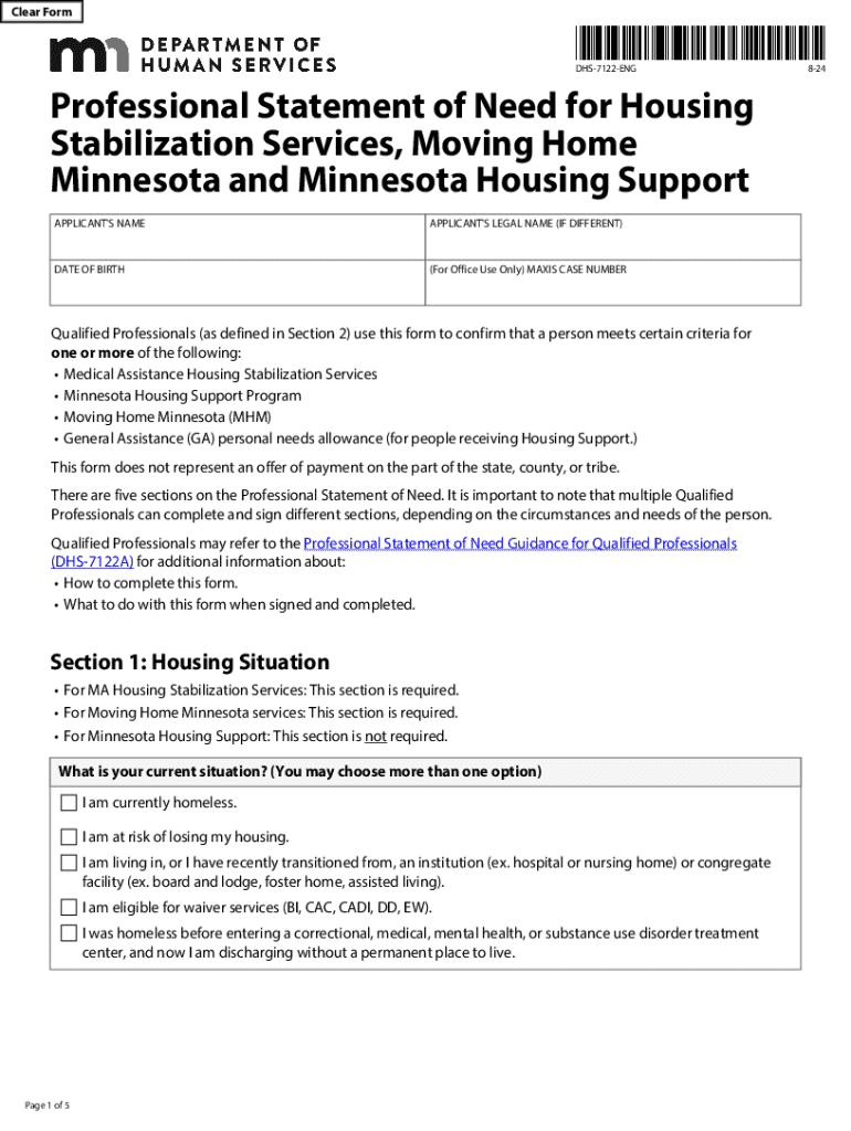 The Professional Statement of Need for Housing Stabilization Services is a government form used by Qualified Professionals in Minnesota to verify eligibility for housing stabilization services and support programs.