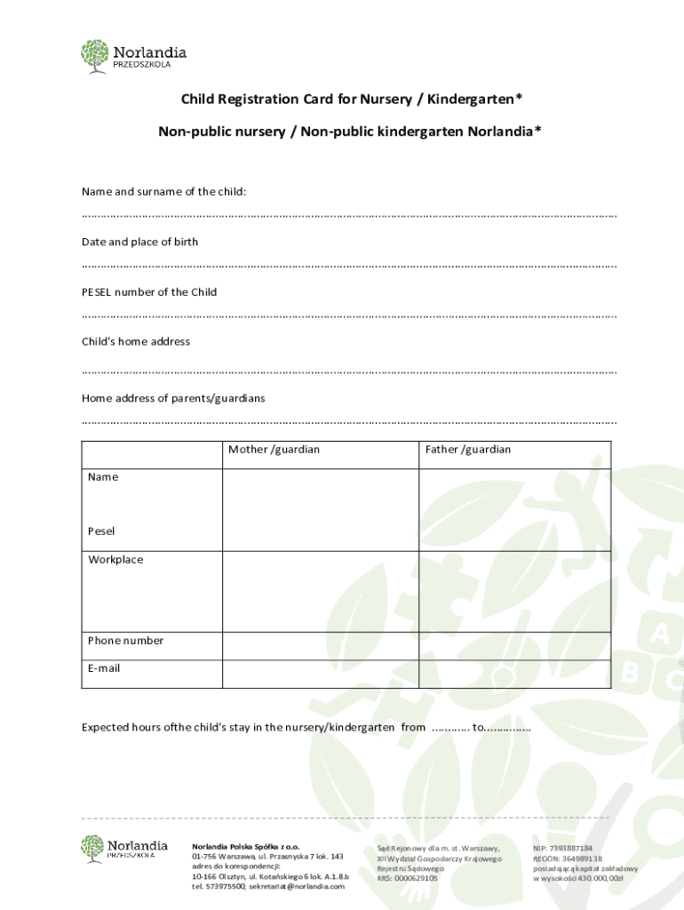 Get the free Child Registration Card for Nursery / Kindergarten
