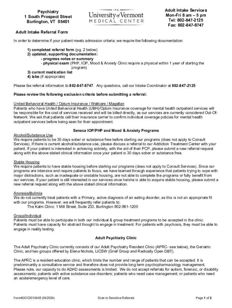 The Adult Intake Referral Form is a referral document used by healthcare providers to refer patients to Psychiatry Adult Intake Services in Burlington, Vermont.