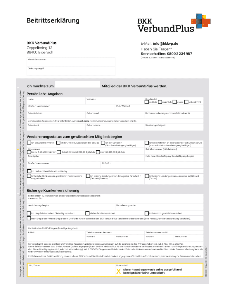 Die BKK VerbundPlus Mitgliedserklärung ist ein Formular, das von Einzelpersonen in Deutschland verwendet wird, um Mitglied bei der BKK VerbundPlus Krankenversicherung zu werden.