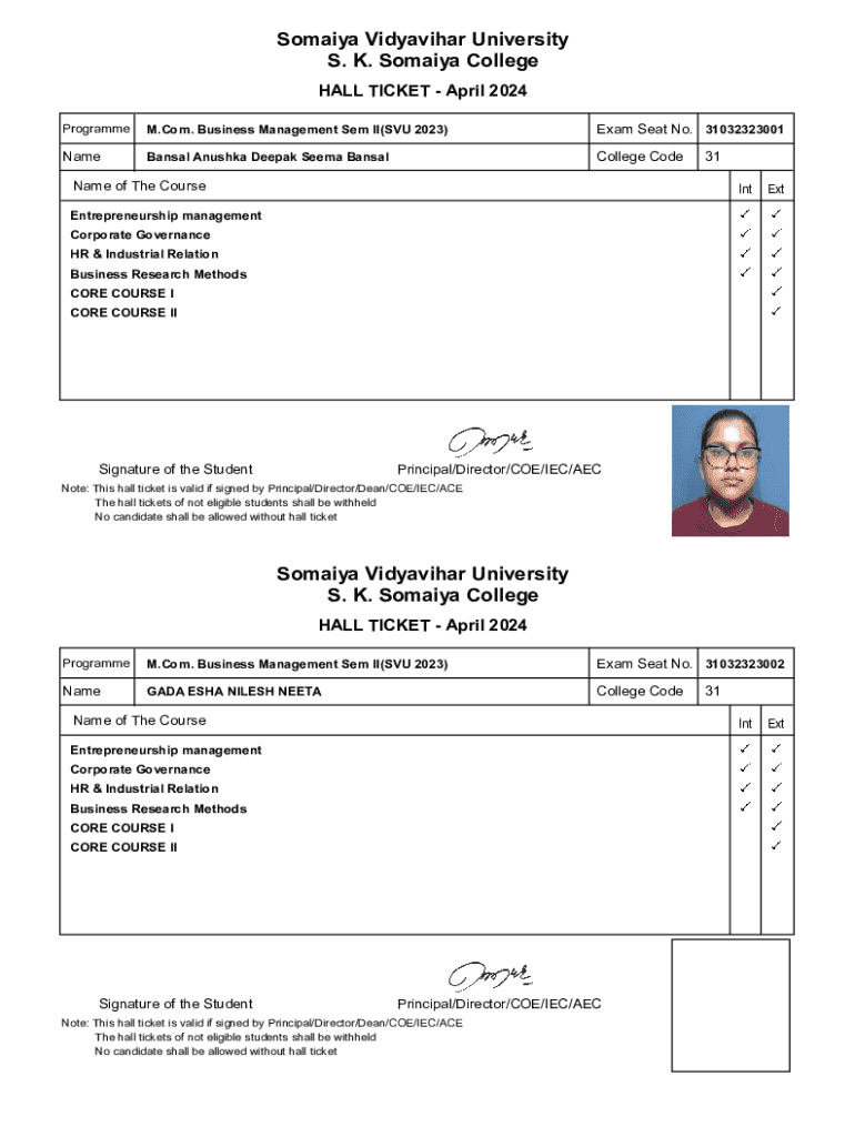 Get the free Somaiya Vidyavihar University Hall Ticket