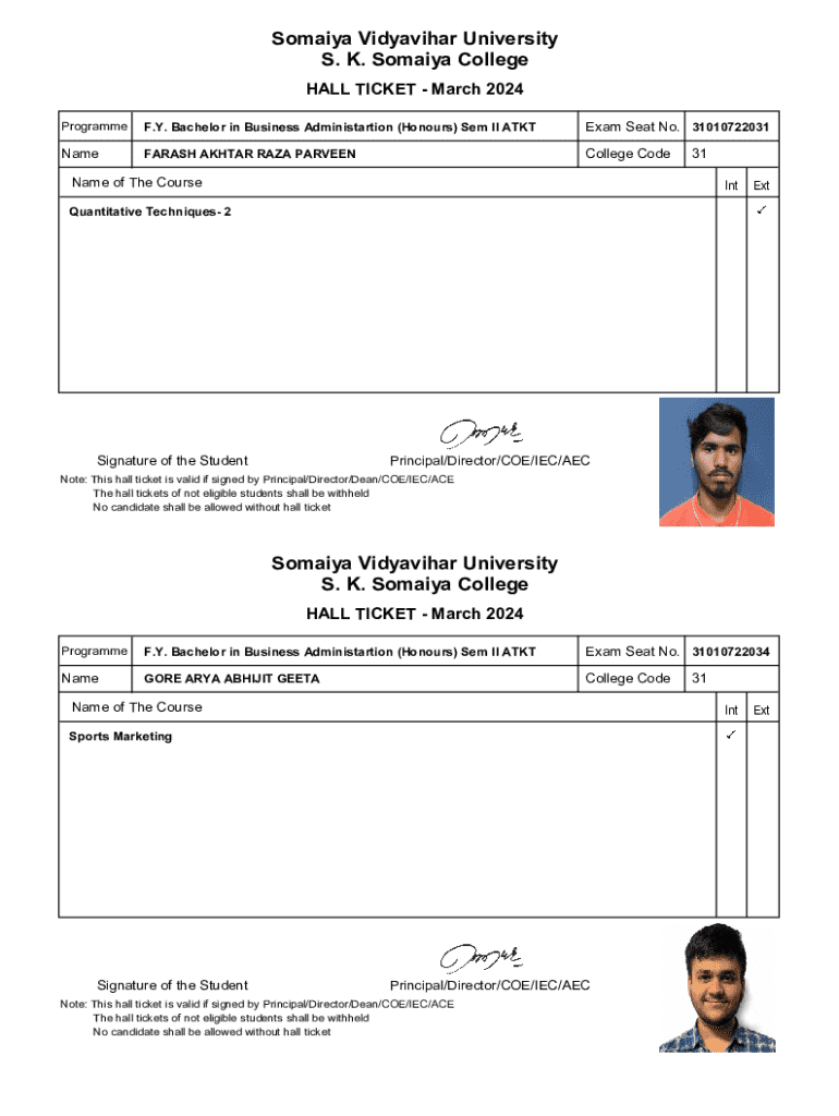 Students eligible for the ATKT exam at Somaiya Vidyavihar University are required to obtain their hall tickets. This includes Bachelor in Business Administration (Honours) students, among others. The finalization of the hall ticket involves the signatures of key authorities such as the Principal, Director, Dean, or Controller of Examinations (COE).