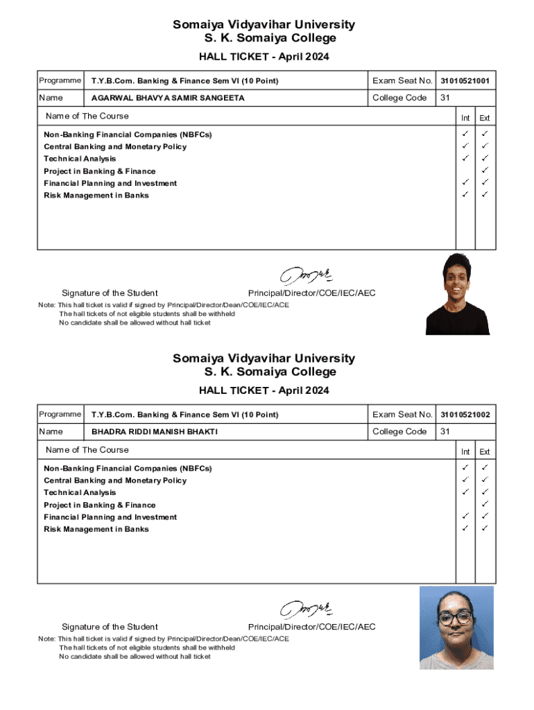 The Somaiya Vidyavihar University Hall Ticket serves as an essential examination admission document for students, specifically tailored for T.Y.B.Com. Banking & Finance Sem VI students. This document lists particulars such as the student's name, seat number, college code, and enrolled courses. Its relevance extends beyond identification; it functions as the formal authorization required for students to access exam venues.