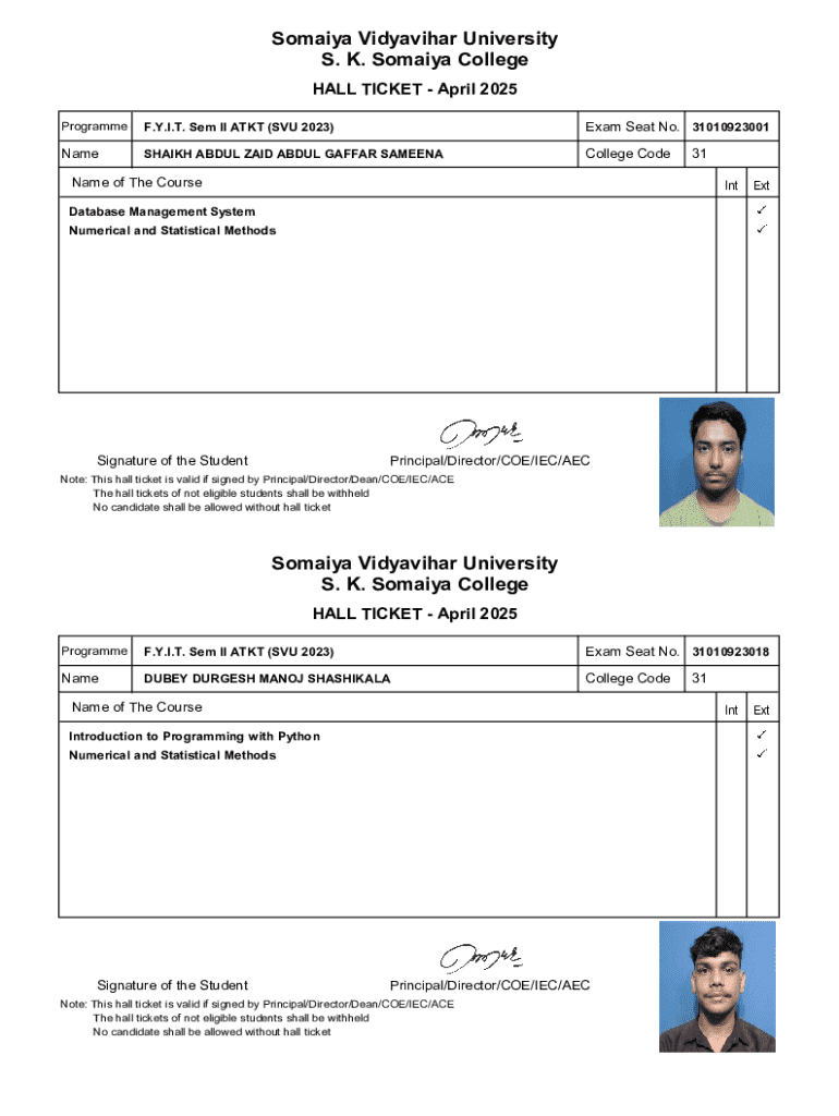 The Somaiya Vidyavihar University Hall Ticket is an examination document used by students to gain entry into the April 2025 semester exams.