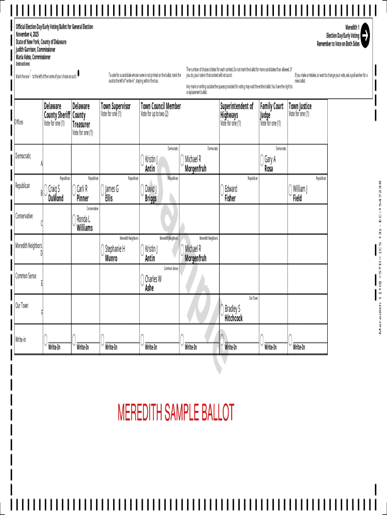 The New York General Election Ballot can be used by registered voters in New York State. You must be at least 18 years old and a resident of Delaware County to participate in this election.