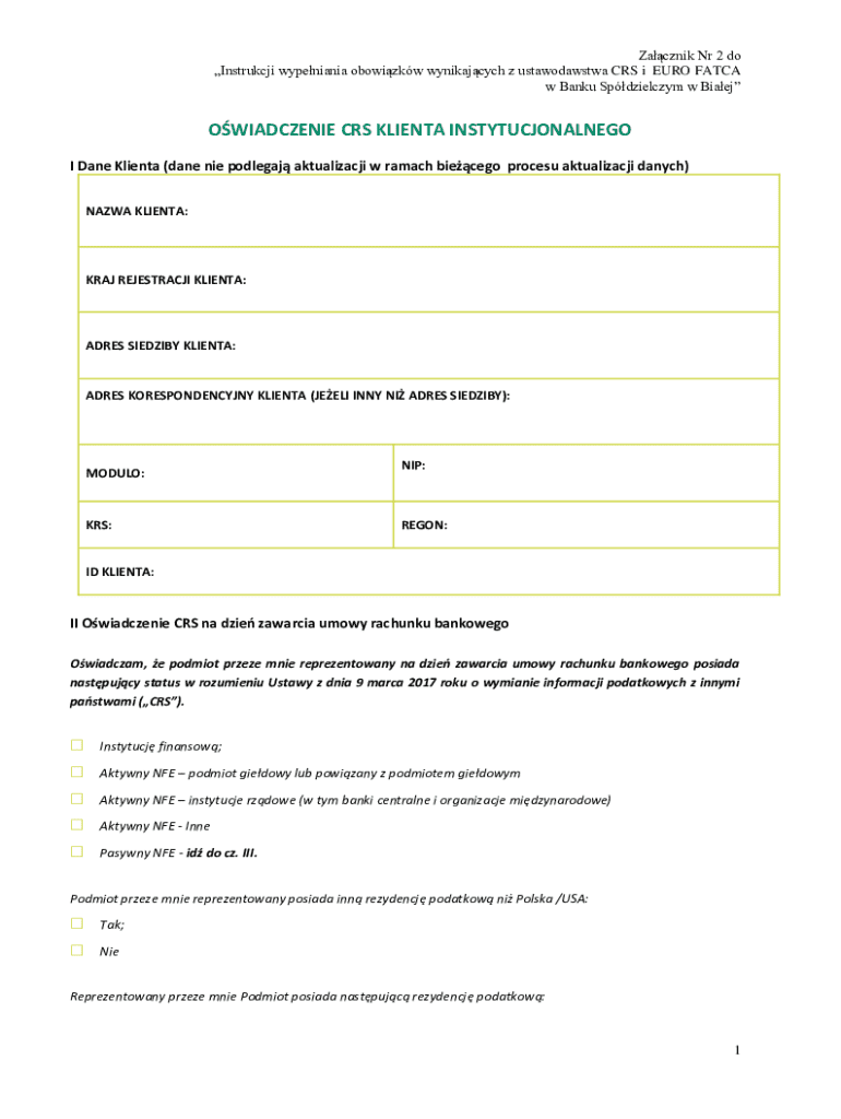 The CRS Client Declaration Form must be filled out by institutional clients who need to declare their tax residency status when opening a bank account, as well as by bank employees who verify this information.