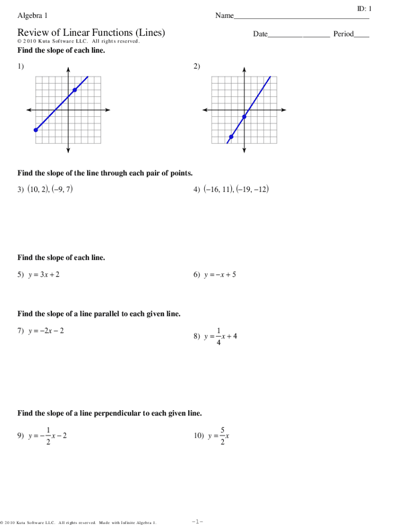 The Algebra 1 Linear Functions Worksheet is a comprehensive educational resource that focuses on key concepts related to linear functions. This worksheet is specifically designed to enhance students' understanding of essential topics, including slope calculations, graphing lines, and the slope-intercept form. Its primary purpose is to reinforce algebra concepts, making it an invaluable tool for both students and educators looking to bolster their math skills.