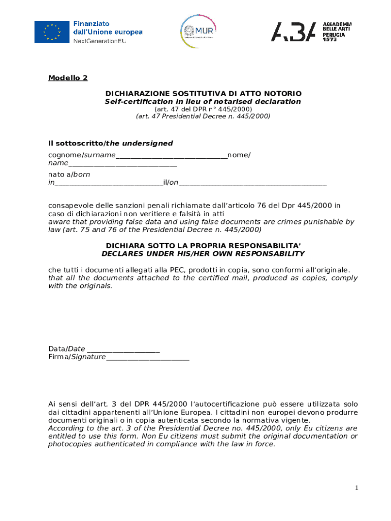 Il Modello 2 può essere utilizzato da cittadini italiani e da cittadini UE che necessitano di autocertificare documenti per prassi legali o amministrative in Italia.