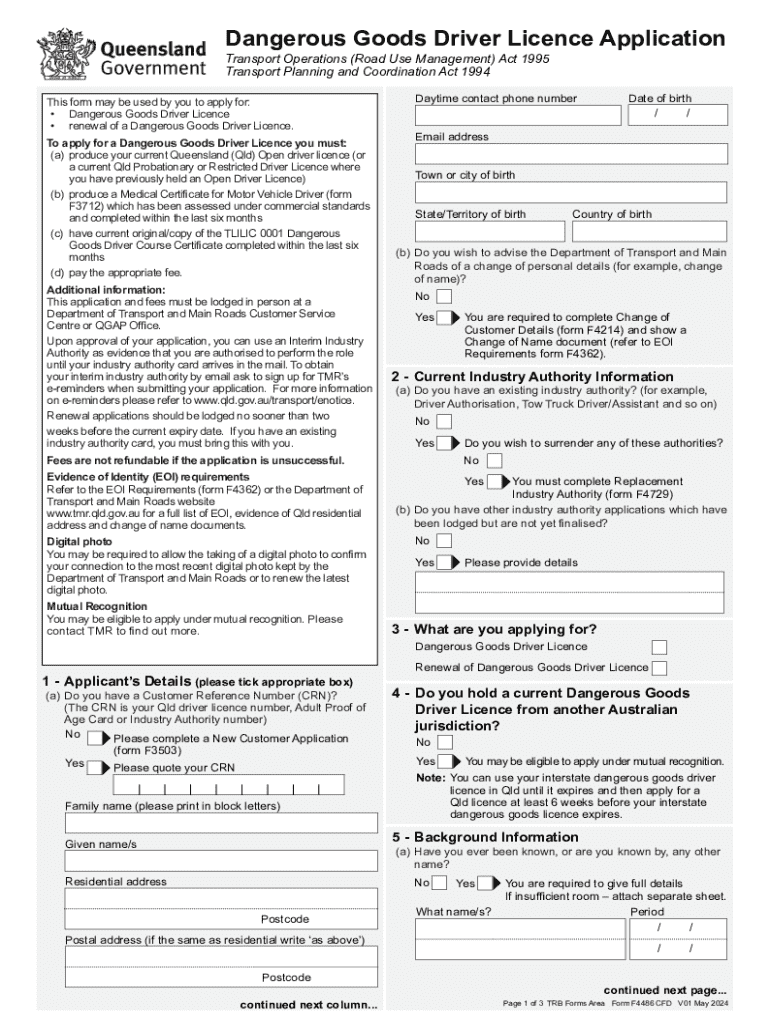 The Queensland Dangerous Goods Driver Licence Application is a government form used by individuals in Queensland, Australia, to apply for or renew a Dangerous Goods Driver Licence.