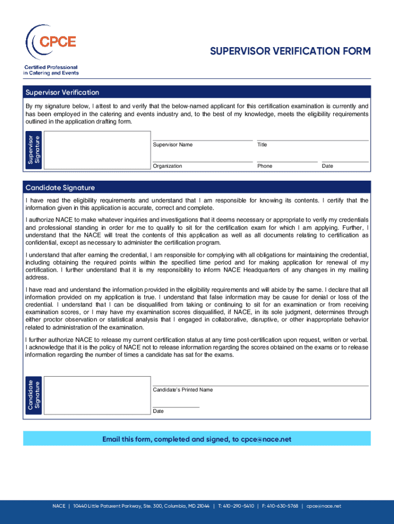 The Supervisor Verification Form is a crucial document in the certification process for individuals aspiring to demonstrate their proficiency in the catering and events industry. Its primary role is to verify a candidate's employment and eligibility by requiring the supervisor's endorsement. This form is essential for certification exam applications, ensuring that candidates meet the necessary requirements.