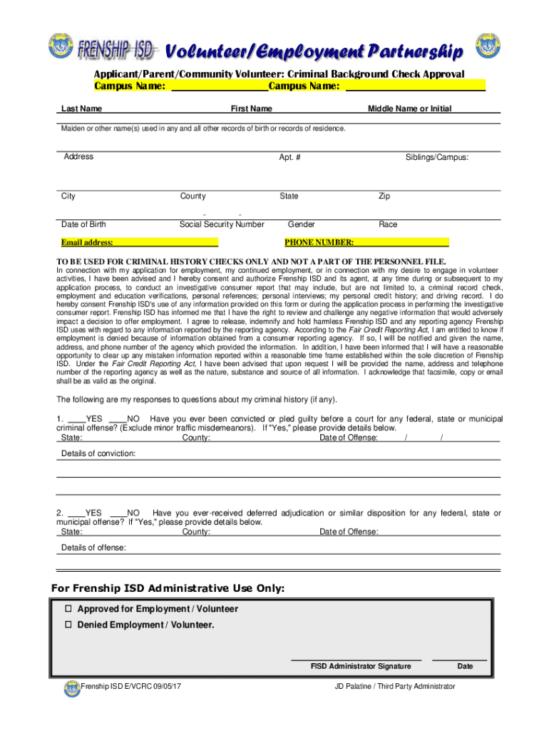 The Volunteer Employment Criminal Background Check form is a consent document used by Frenship ISD to conduct criminal history checks on applicants for employment or volunteer activities.