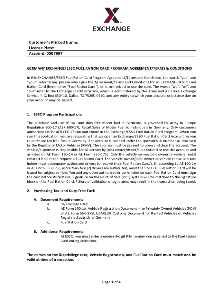 The Germany Exchange/ESSO Fuel Ration Card Program Agreement is designed to facilitate the purchase of tax- and duty-free motor fuel in Germany. This agreement operates under Army in Europe Regulation 600-17 (AER 600-17), which provides governance guidelines. The significance of this program lies in its provision of tax-free fuel, making it essential for eligible users, particularly military personnel and their families.