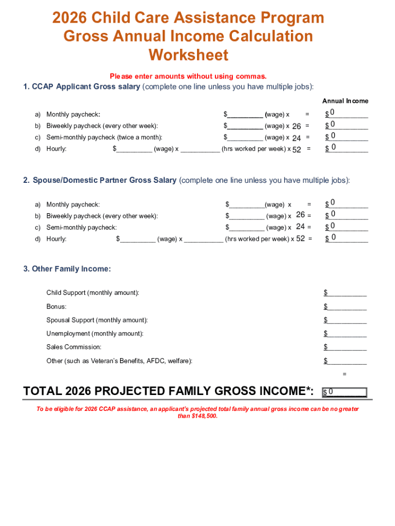The 2026 Child Care Assistance Program Income Worksheet is a budget template used by families to calculate projected gross income for eligibility in child care assistance programs.
