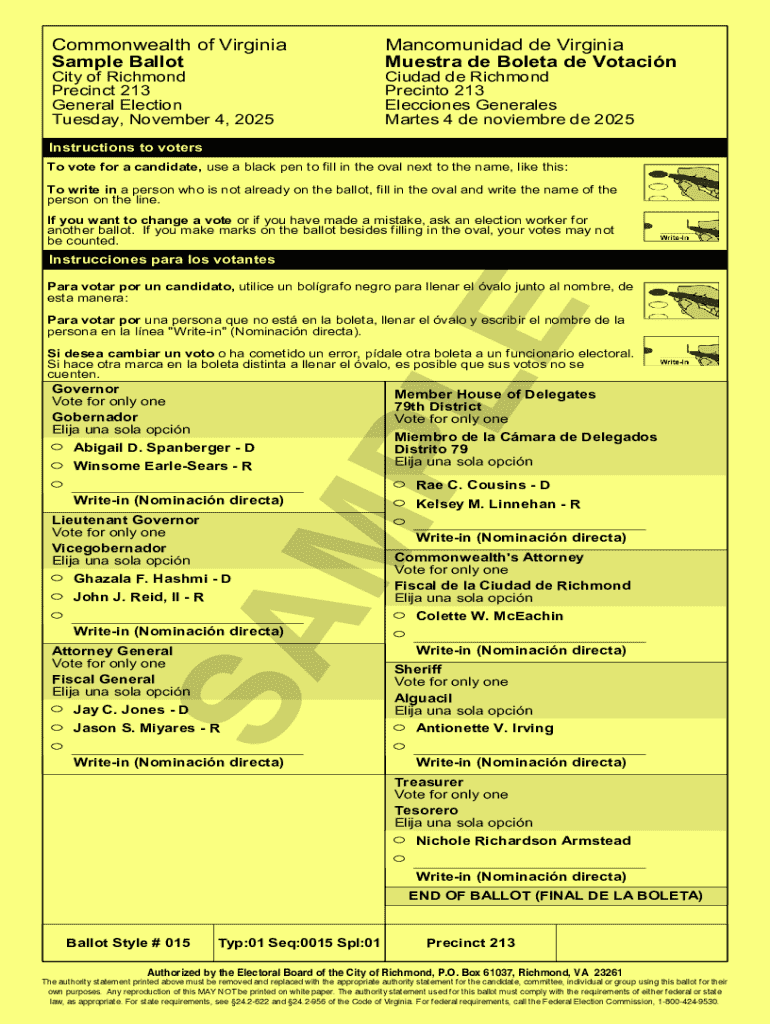The Virginia General Election Sample Ballot is a government form used by voters in Virginia to guide them in completing their ballots for the 2025 General Election.