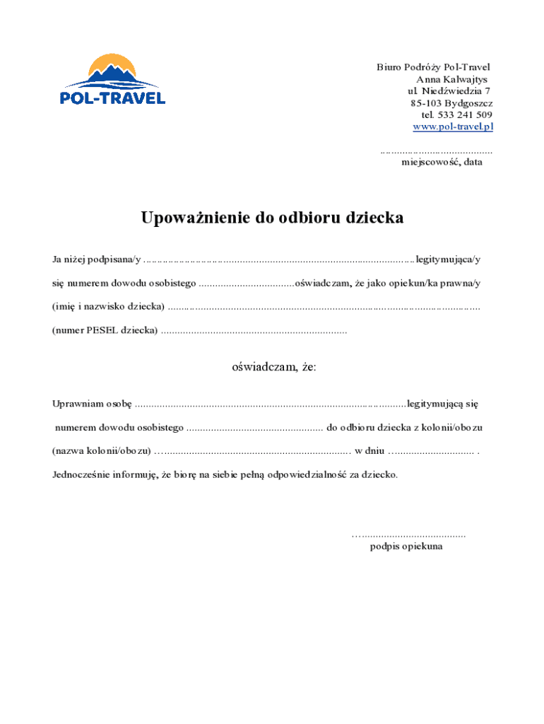 The Child Pickup Authorization Form is a personal affidavit used by legal guardians in Poland to authorize a designated person to pick up a child from a camp or colony.