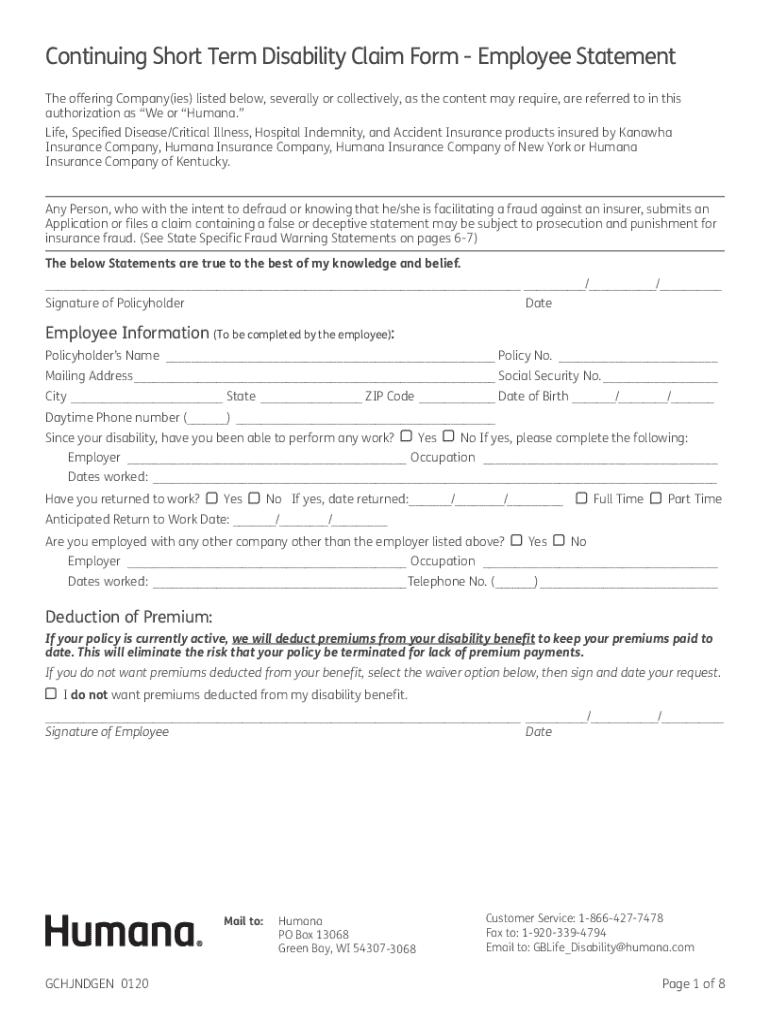 Eligibility for the Continuing Short Term Disability Claim Form includes employees covered under Humana's short-term disability policy who are currently experiencing a qualifying disability.