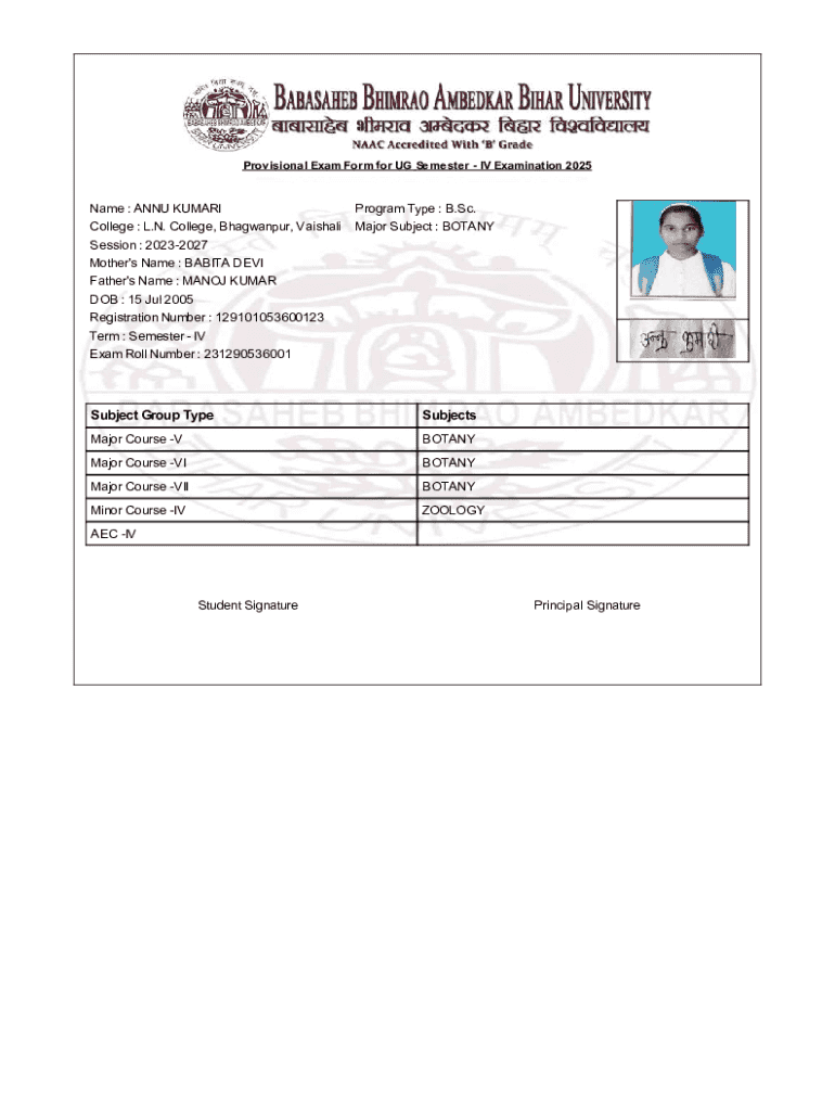 Get the free Provisional Exam Form for UG Semester IV