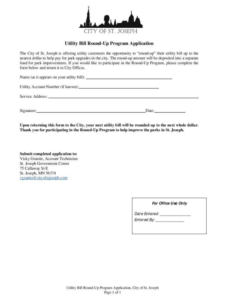 The Utility Bill Round-Up Program Application is intended for utility customers residing in St. Joseph, Minnesota. Any resident with an active utility account qualifies to apply. By submitting the application, they can play an active role in funding local park enhancements, benefiting both themselves and their neighbors.