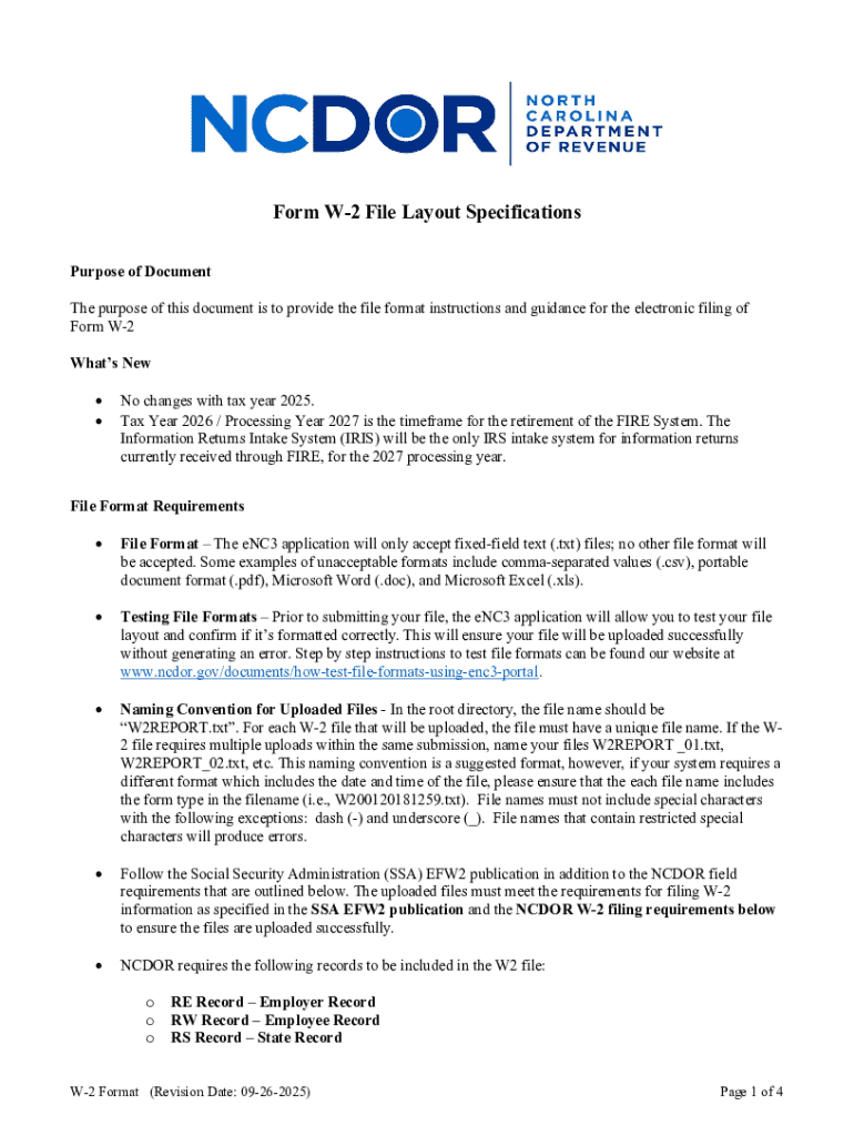 The Form W-2 File Layout Specifications document outlines the necessary format and structure for electronic filing of W-2 forms in North Carolina. This documentation is crucial for ensuring accurate and compliant tax reporting for the tax year 2025. Understanding these specifications aids employers and businesses in efficient tax processes.