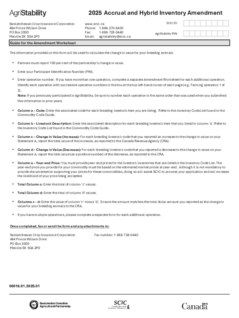 The Accrual and Hybrid Inventory Amendment Form is crucial for participants in the AgriStability program in Saskatchewan. This form assists in accurately reporting changes in the valuation of breeding livestock, which is essential for eligibility in AgriStability benefits. Key details required include various livestock values and associated codes.