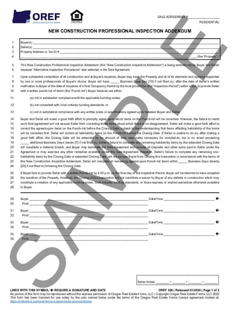 To use the New Construction Professional Inspection Addendum, you must be involved in a residential property transaction in Oregon, either as a buyer or seller of a newly constructed home.