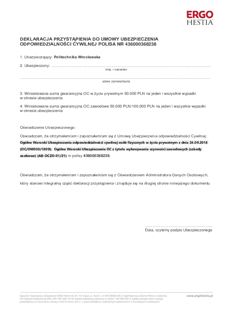 The primary purpose of the Poland Civil Liability Insurance Application is to secure civil liability insurance, which provides significant protection to individuals and businesses. Civil liability insurance safeguards against potential financial damages and legal claims that may arise from everyday activities.