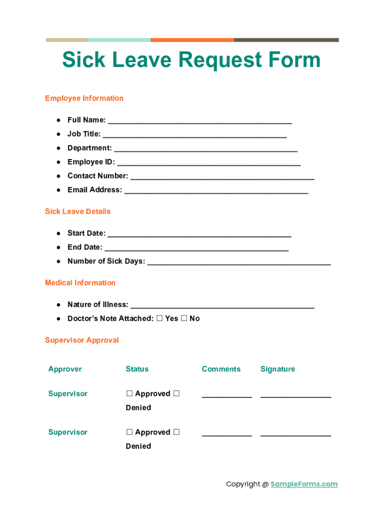 The Sick Leave Request Form is designed for employees who need to request time off due to illness. It is essential for employees to refer to their company’s sick leave policy for further eligibility requirements.