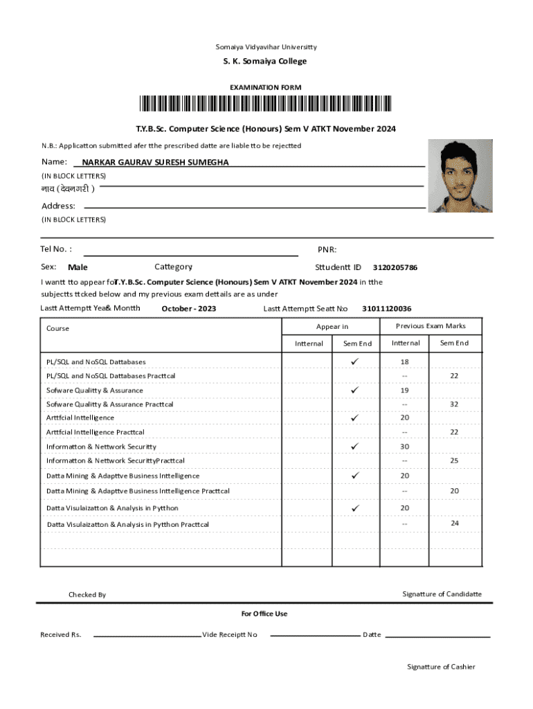 The Somaiya Vidyavihar University Exam Form is essential for students applying for re-examinations within the university. Specifically, it serves T.Y.B.Sc. Computer Science (Honours) students for the November 2024 examinations. This students' exam registration form helps streamline the process of applying for exams, ensuring that all necessary information is collected efficiently.