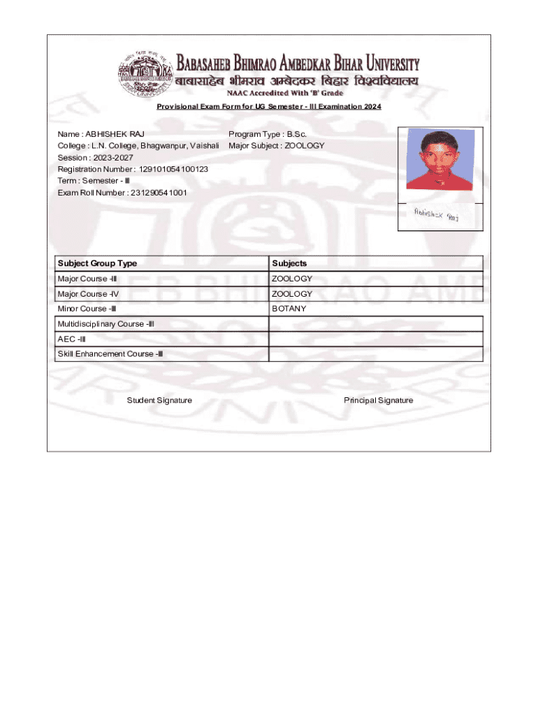 Undergraduate students enrolled in the 2023-2027 session at L.N. College, Bhagwanpur are eligible to fill out the Provisional Exam Form for UG Semester - III Examination 2024.