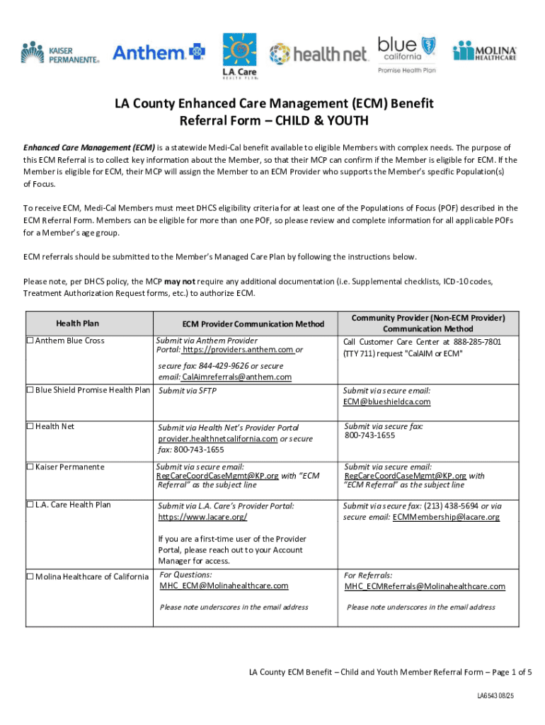 The LA County ECM Benefit Child and Youth Referral Form is a healthcare document used by Medi-Cal members to determine eligibility for Enhanced Care Management (ECM).