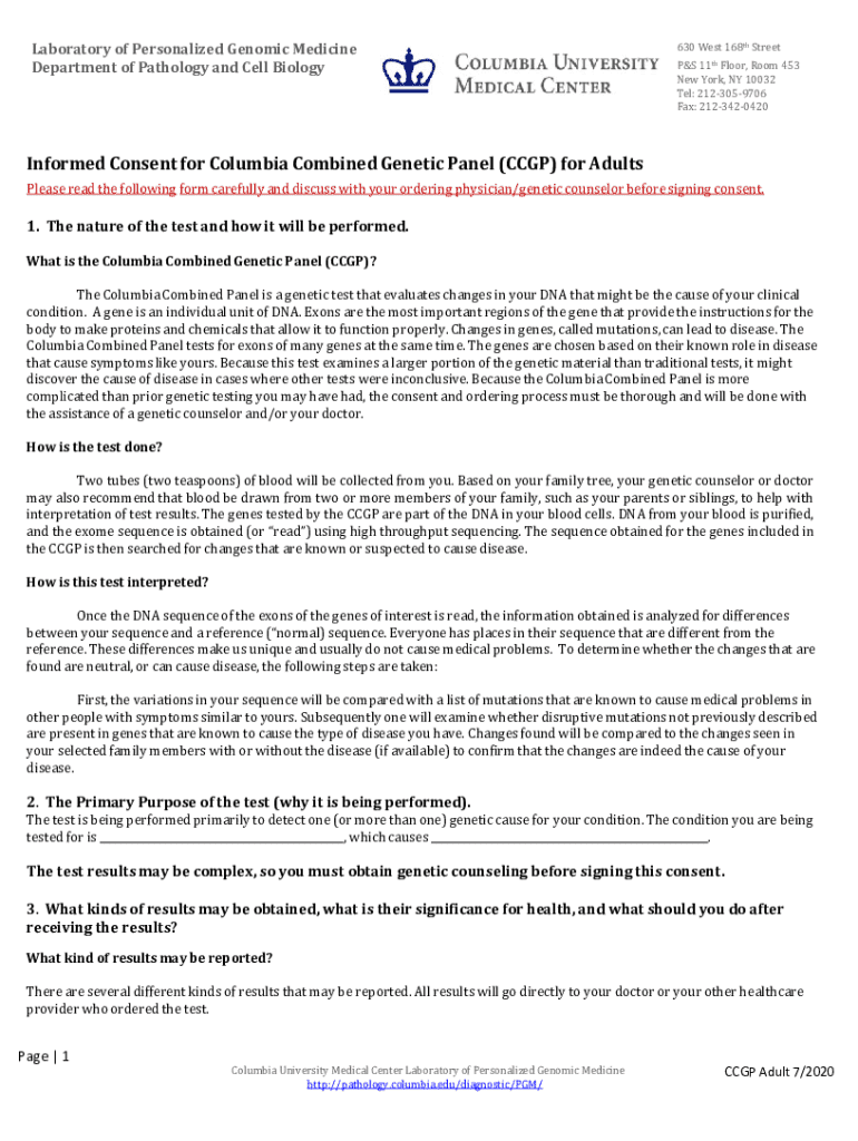 The Informed Consent for Columbia Combined Genetic Panel (CCGP) for Adults is a patient consent form used by Columbia University Medical Center to obtain consent for genetic testing.