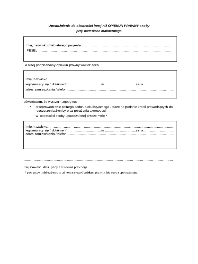 The Medical Consent for Minor's Eye Exam is a legal document used by legal guardians in Poland to grant permission for a minor to undergo an eye examination in the presence of an authorized person.