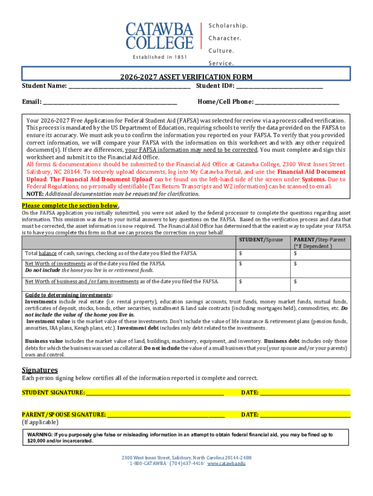 The 2026-2027 Asset Verification Form is a financial document used by Catawba College to verify the asset information submitted by students on their FAFSA.