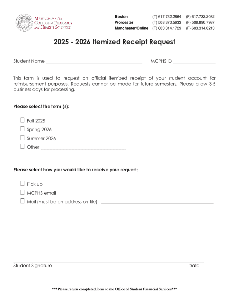 This form is intended for students currently enrolled at MCPHS who need an official itemized receipt for reimbursement. Eligibility also extends to authorized guardians or representatives completing the form on behalf of the student.