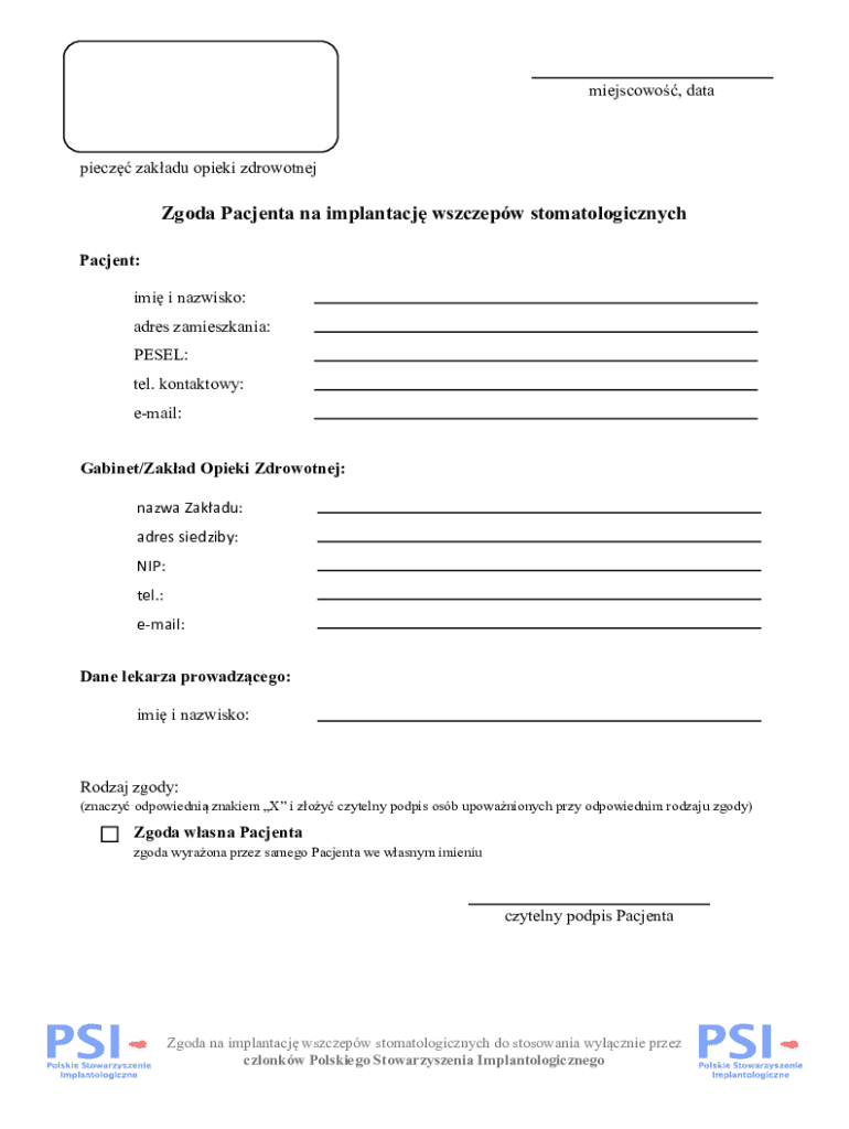 The Dental Implant Consent Form is a medical consent document used by patients in Poland to authorize dental implant procedures.