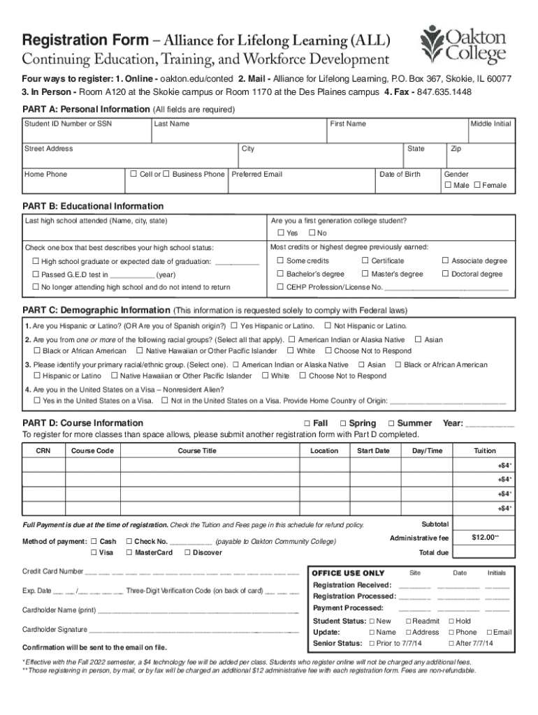 The Alliance for Lifelong Learning Registration Form serves as a key tool for enrolling in continuing education courses at Oakton Community College. This form streamlines the enrollment process by collecting essential personal information, course details, and payment data. Prospective students can submit their forms electronically or through traditional methods such as mail or in-person submission.