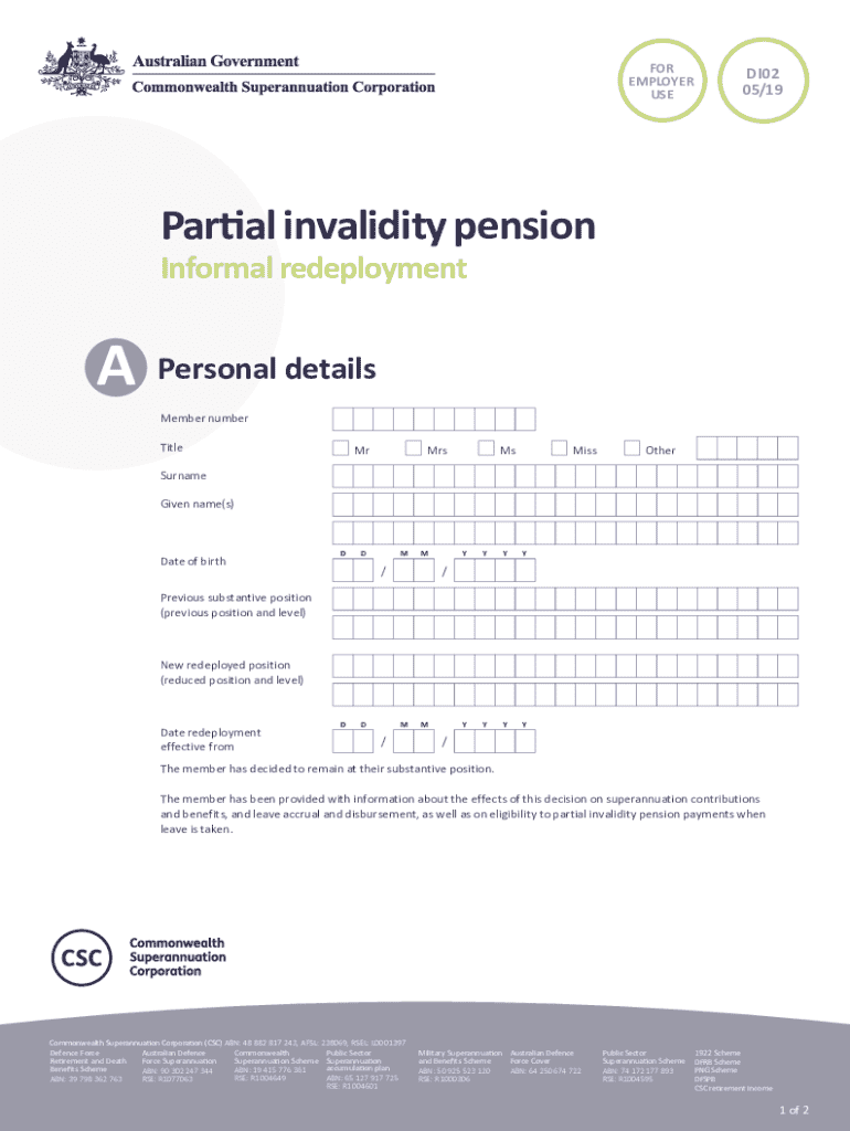 The Partial Invalidity Pension Form is an employment document used by employers in Australia to document employee redeployment due to partial invalidity.