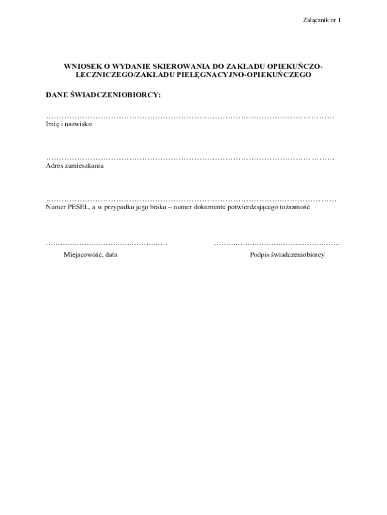 The form is designed for patients or their legal representatives who require a referral to a nursing care facility in Poland.