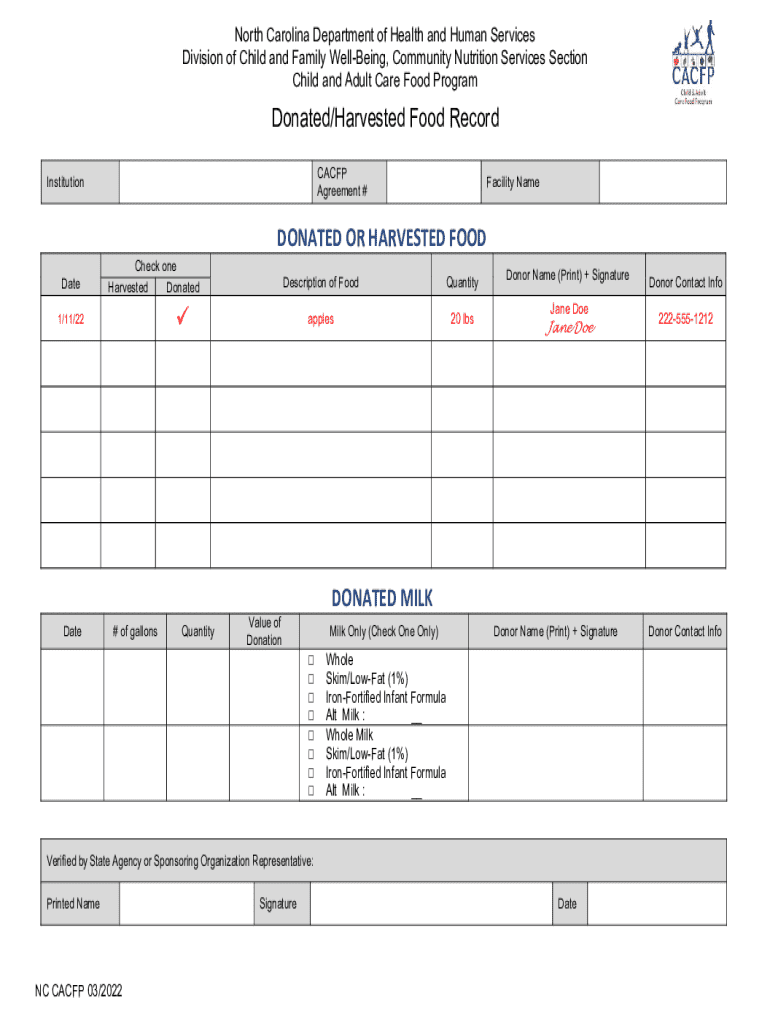 The North Carolina Donated Food Record is a government form used by institutions to document donated food for the Child and Adult Care Food Program (CACFP). It serves to ensure proper tracking and accountability of food donations.